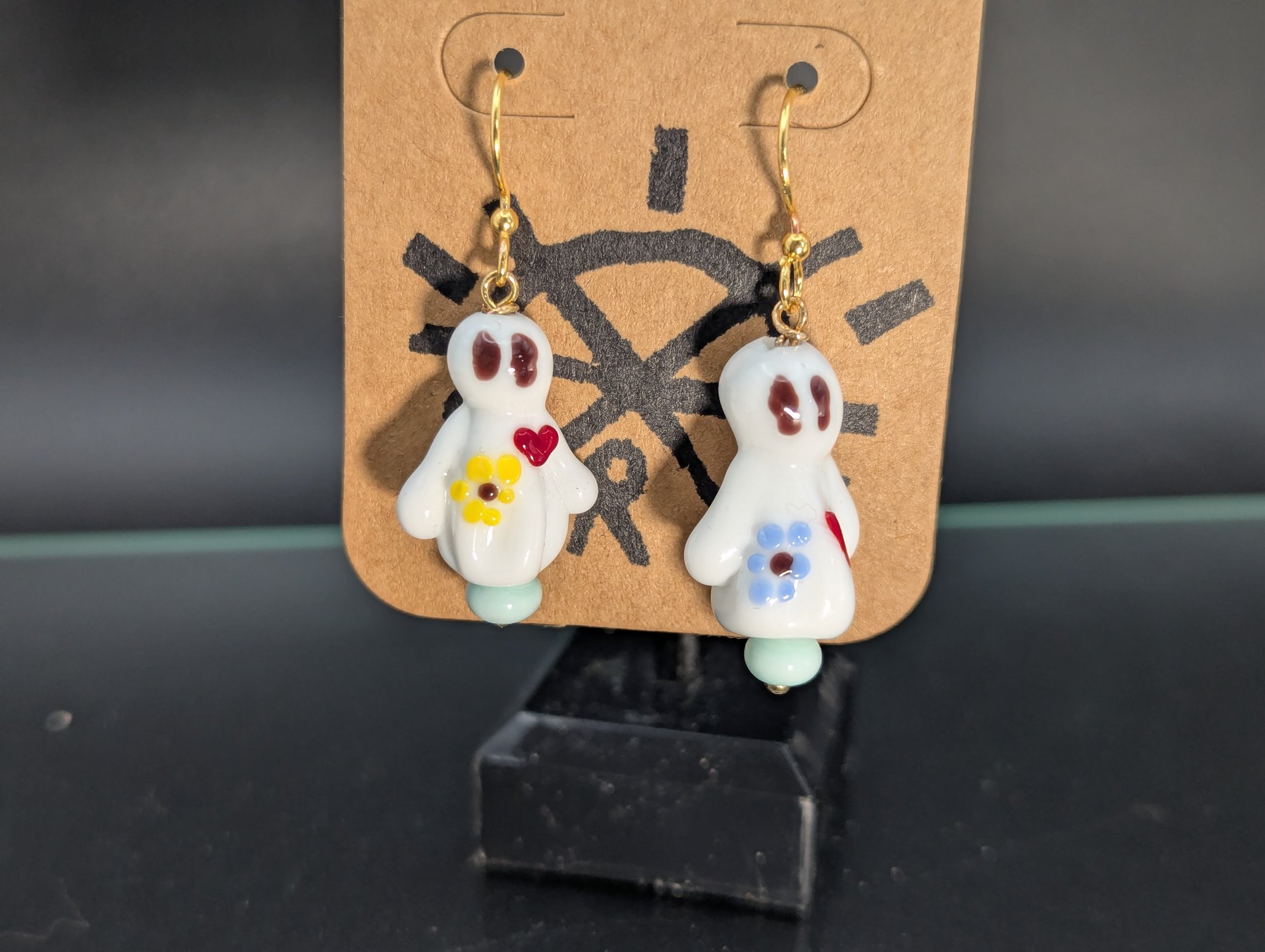 Sculptural Earrings featuring a pair of ghosts with hearts and yellow and blue flowers, with a pastel blue base bead. Hanging beaded earrings.