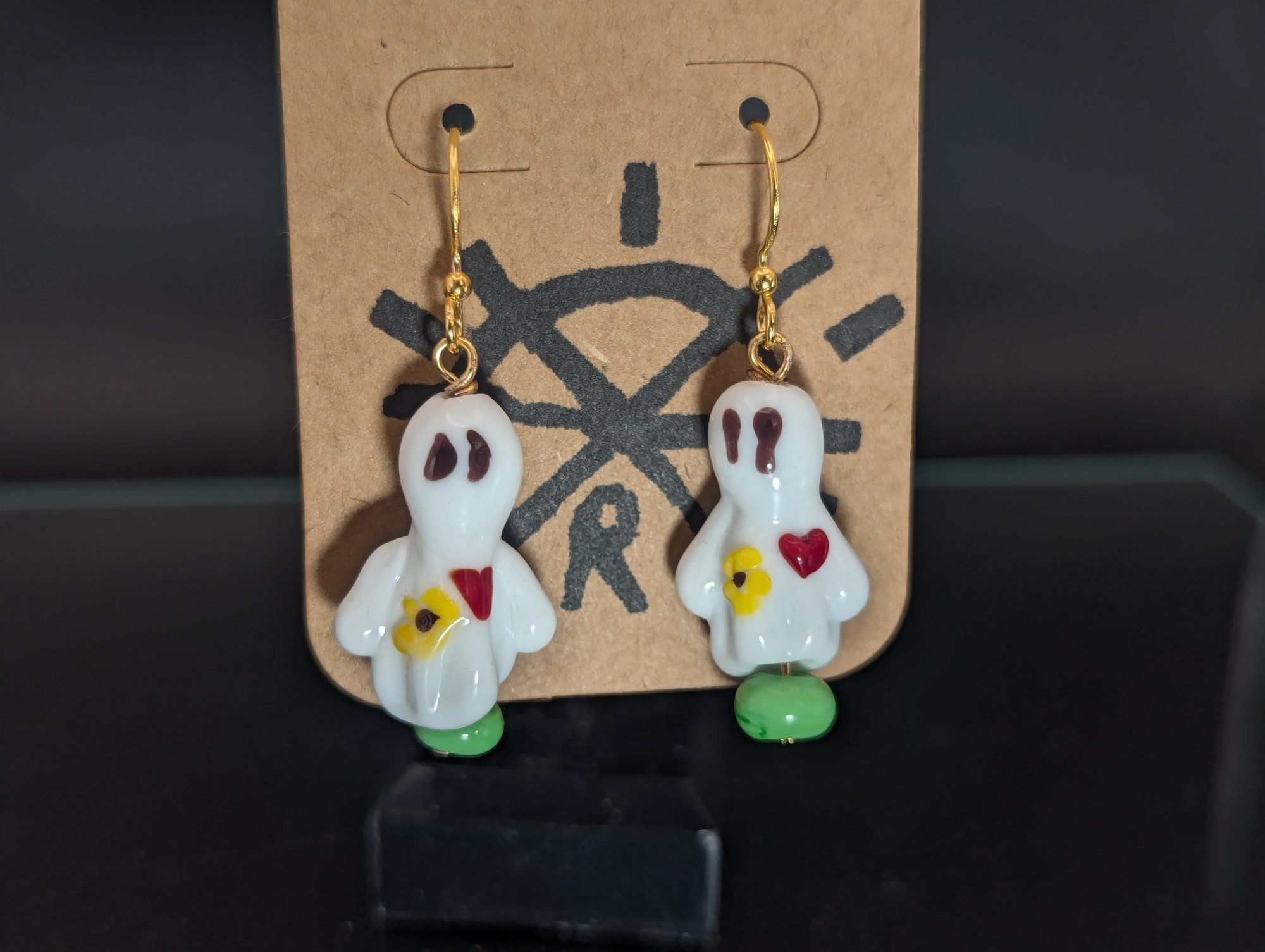 Sculptural Earrings featuring a pair of ghosts with hearts and yellow flowers, with a light green base bead. Hanging beaded earrings.