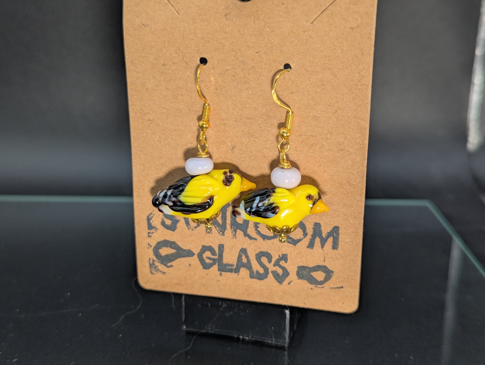 Sculptural Earrings featuring an American goldfinch, a song bird native to the continental United States and Canada. Hanging beaded earrings.