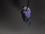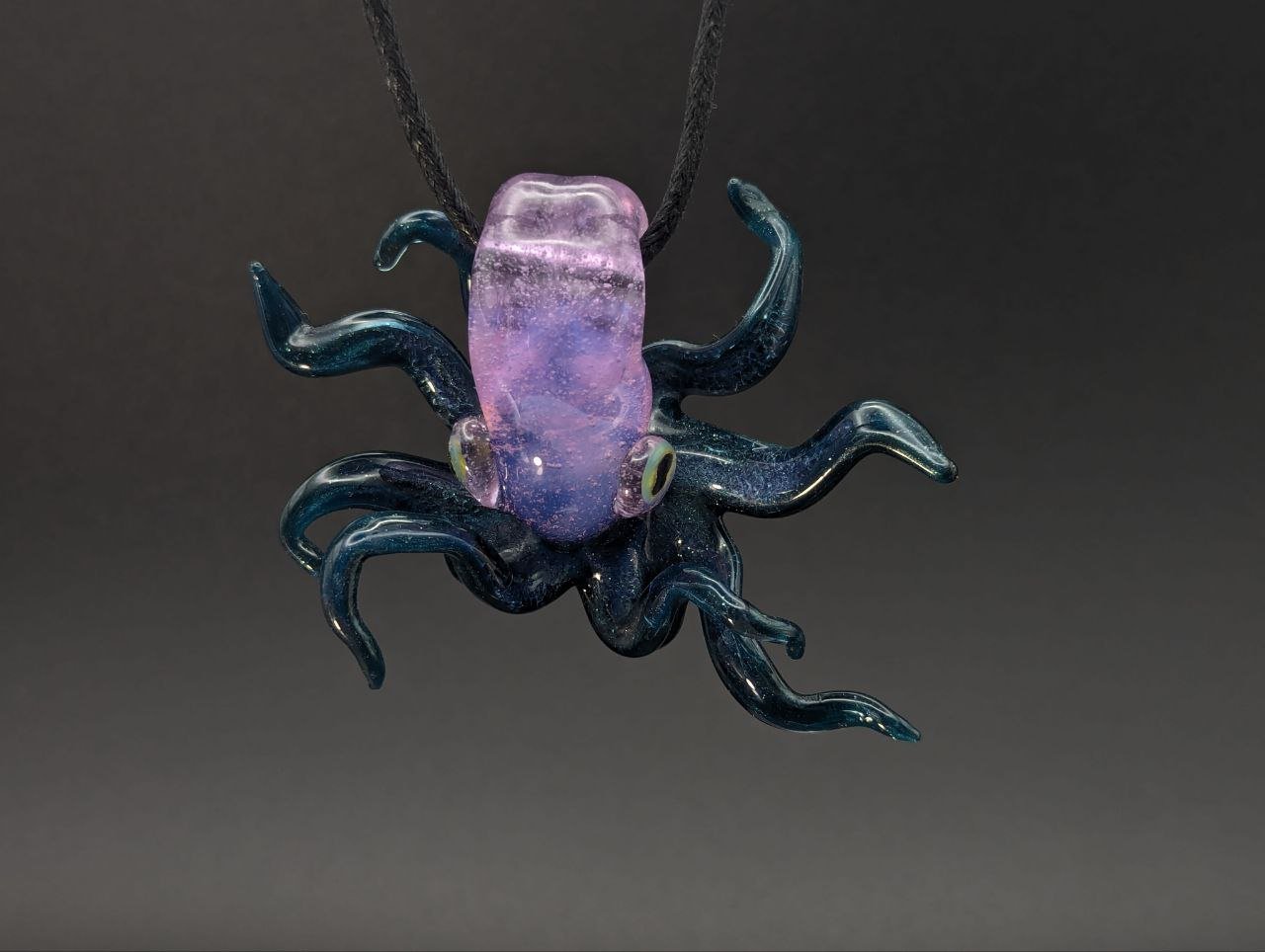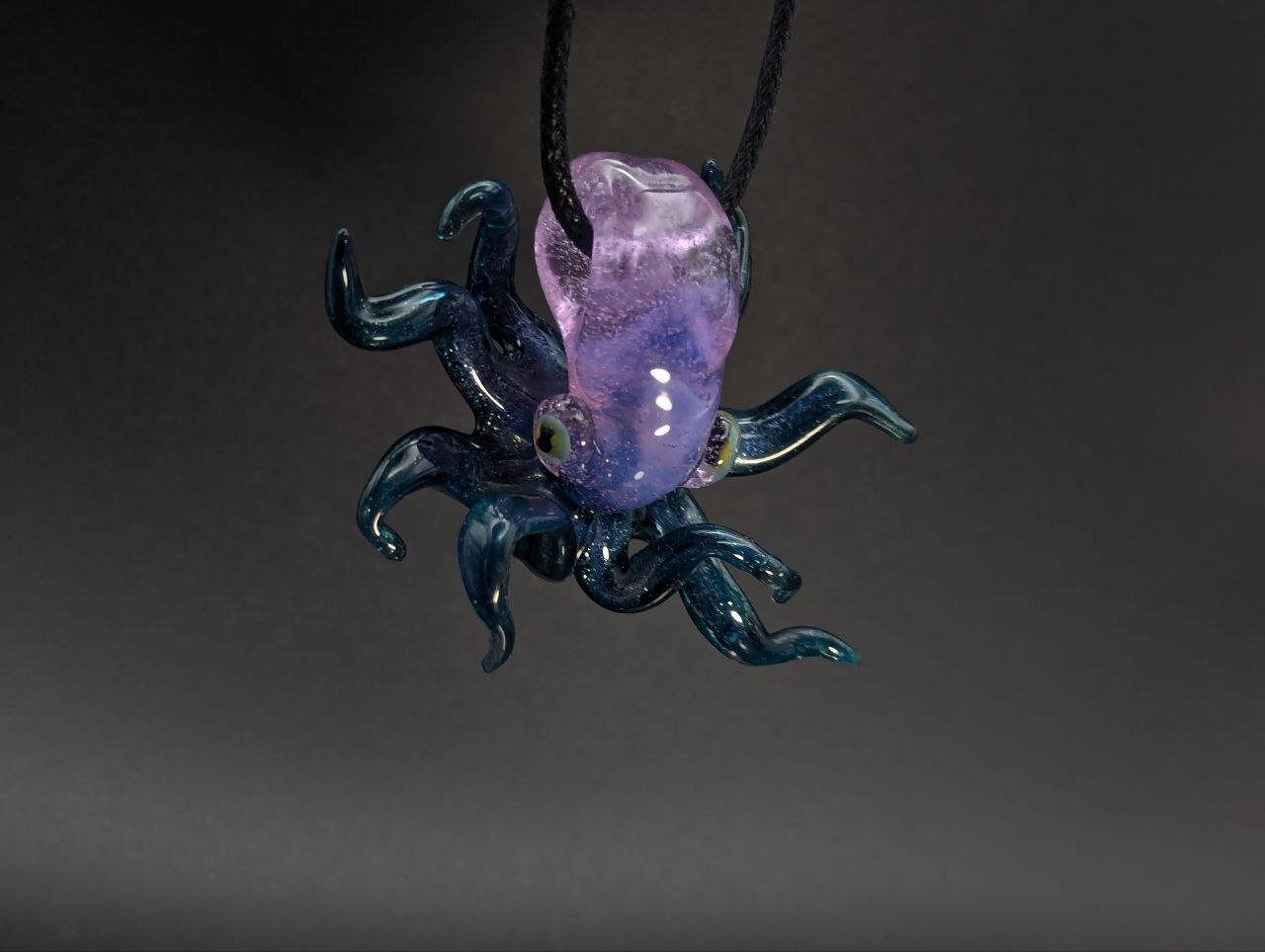 An octopus featuring a bail through it's head. A hazy purple head with a sparkly blue body.